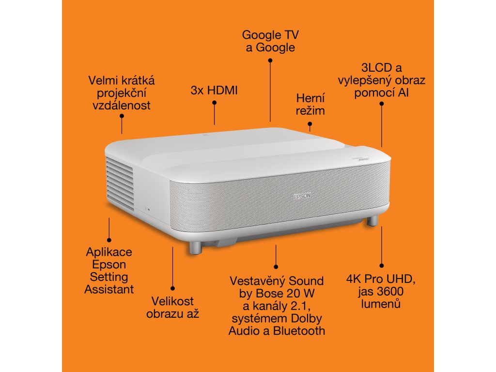 Pohlcující filmové zážitky s křišťálově čistým obrazem, úhlopříčkou obrazovky až 120" a snadným nastavením s aplikací Epson Setting Assistant - Google TV a Google Assistant